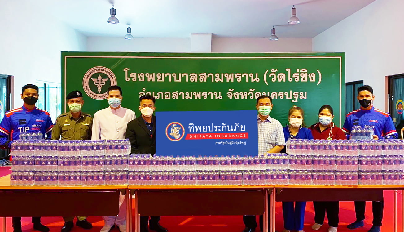 คุณศุภกิจ จิตร์เพิ่มพูลผล รก.ผอ.ฝ่ายสื่อสารองค์กรและความรับผิดชอบต่อสังคม นำทีม TIP Smart Assist บริษัท ทิพยประกันภัย จำกัด (มหาชน) มอบน้ำดื่มทิพย จำนวน 5,000 ขวด เพื่อนำไปบริการประชาชนที่มารับการฉีดวัคซีนโควิด-19 รวมถึงแพทย์และบุคลากรทางการแพทย์ที่ปฏิบัติหน้าที่ โดยมี นพ.ทินกร ชื่นชม ผอ.รพ.สามพราน นางพัชรี เกษรบุญนาค รอง ผอ.รพ.สามพราน รับมอบ ณ โรงพยาบาลสามพราน (วัดไร่ขิง)