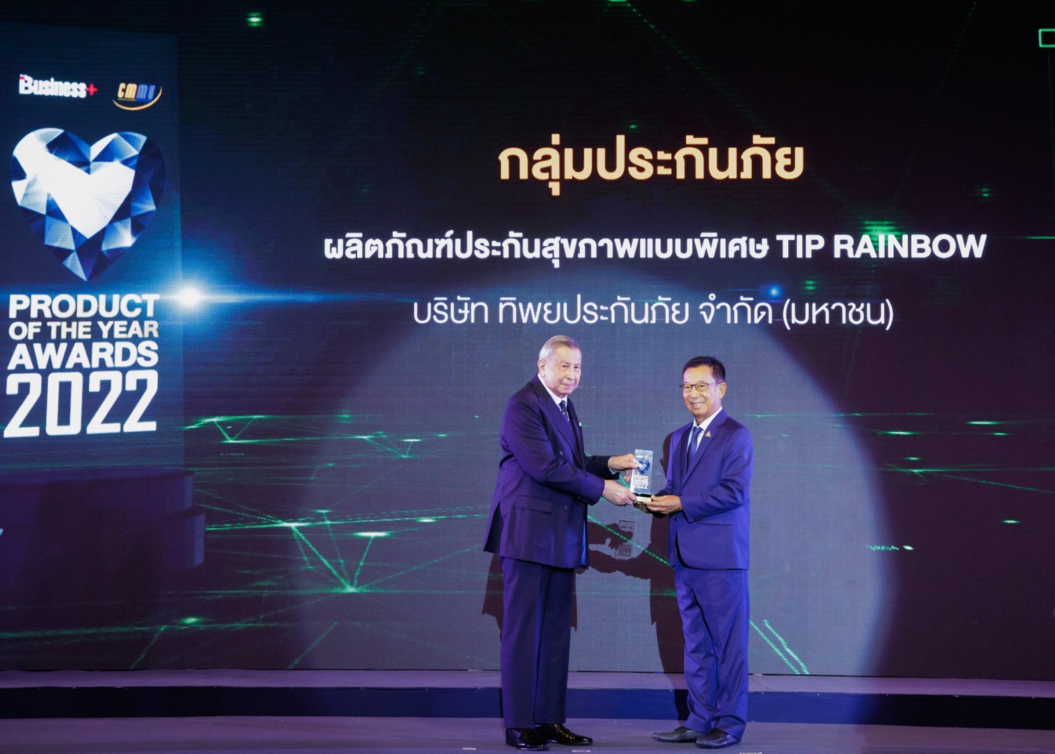 พลเอกสมชาย ธนะรัชต์ กรรมการบริษัท บมจ.ทิพยประกันภัย รับรางวัล จาก ฯพณฯ นุรักษ์ มาประณีต องคมนตรี ในฐานะประธานในงาน “BUSINESS+ PRODUCT OF THE YEAR AWARDS 2022” ประเภทสินค้าและบริการกลุ่มประกันยอดเยี่ยมแห่งปี ประกันสุขภาพแบบพิเศษ “TIP RAINBOW”