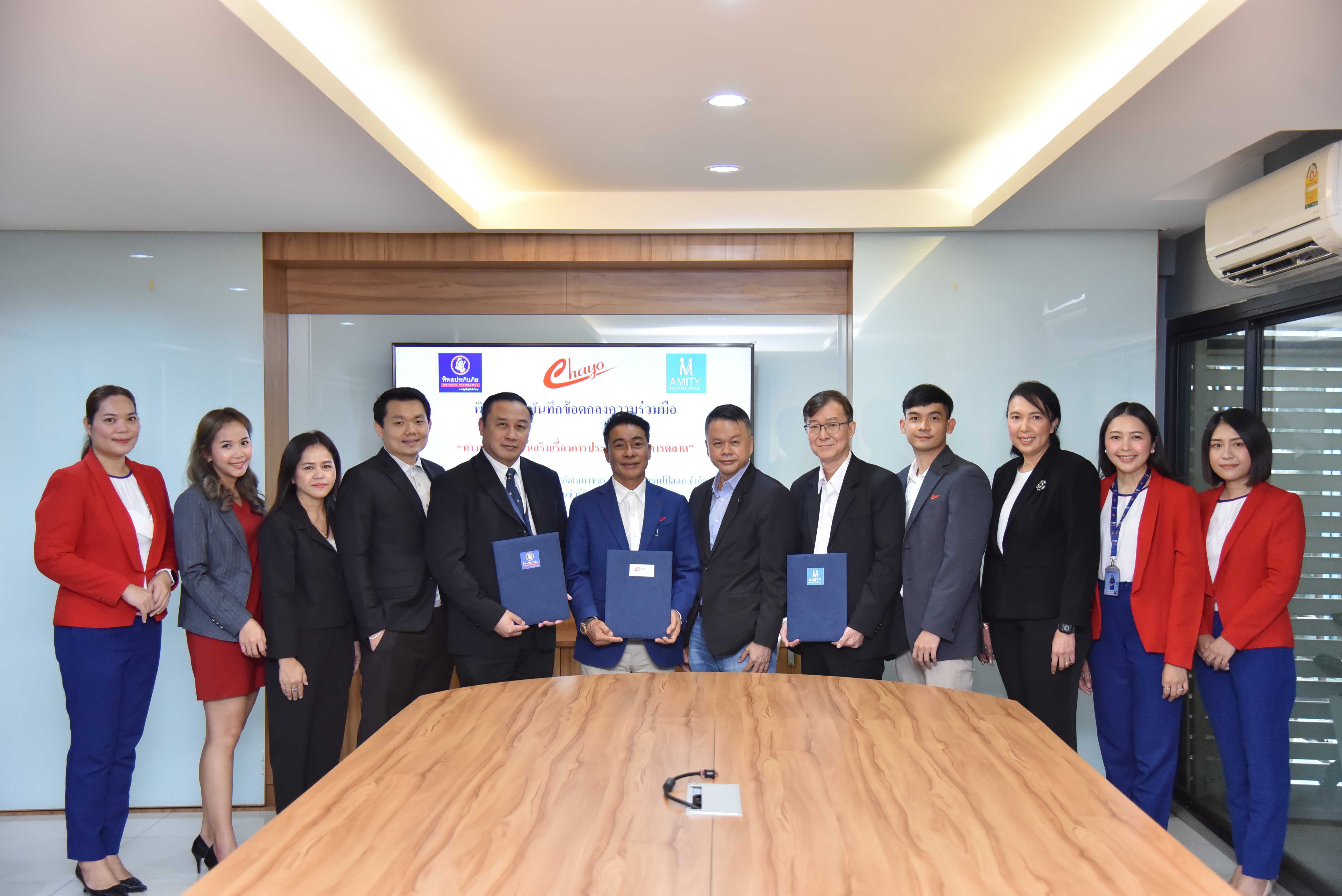 นายสุขสันต์ ยศะสินธุ์ ประธานกรรมการบริหารและประธานเจ้าหน้าที่บริหาร บริษัท ชโย แคปปิตอล จำกัด นายกิตติ ตั้งศรีวงศ์ รองประธานเจ้าหน้าที่บริหาร บริษัท ชโย แคปปิตอล จำกัด และนายวิชัย ลิขิตชัยวรรณ กรรมการผู้จัดการ บริษัท อะมิตี้ อินชัวร์รันซ์ โบรคเกอร์ จำกัด ลงนามบันทึกข้อตกลงร่วมกันเพื่อจัดหากรมธรรม์ประกันภัยและสิทธิพิเศษให้กับกลุ่มลูกค้าสำหรับผู้มาใช้บริการสินเชื่อ “ชโยผ่อนสบาย” อาทิความคุ้มครองประกันอุบัติเหตุ ประกันอัคคีภัย และประกันเบ็ดเตล็ด เป็นต้น ณ บริษัท ชโย แคปปิตอล จำกัด