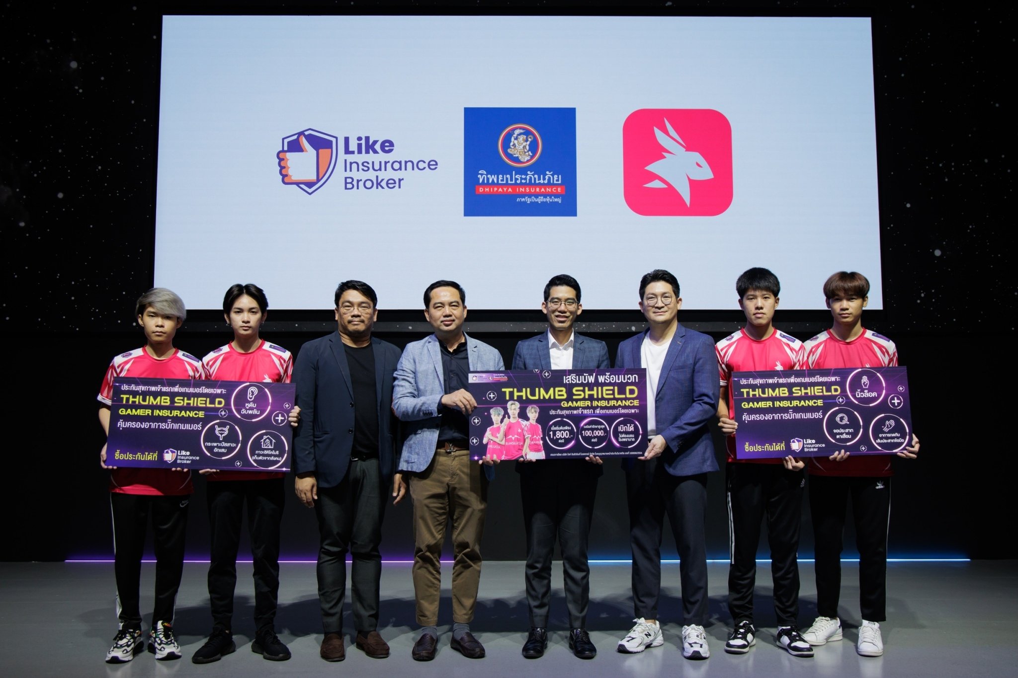 คุณณัฐพล อังควานิช  ผู้อำนวยการฝ่ายพัฒนาธุรกิจและการตลาด บมจ.ทิพยประกันภัย ร่วมกับ คุณชนรัสส์ เบ็ญจอาภรณ์ ประธานเจ้าหน้าที่บริหารบริษัท ไลค์ อินชัวรันส์ โบรคเกอร์ จำกัด  คุณจิรยศ เทพพิพิธ ประธานเจ้าหน้าที่บริหาร บริษัท อินโฟเฟด จำกัด ผู้ให้บริการด้านอี-สปอร์ตแบบครบวงจร จัดงานเปิดตัว  “ธัมป์ ชิลด์ เกมเมอร์ อินชัวร์รันส์ (Thumb Shield gamer insurance) ประกันสุขภาพเจ้าแรก ที่ครอบคลุมความคุ้มครองความเสี่ยงต่อนิ้ว ข้อมือ และสายตา สำหรับผู้เล่นเกม (gamer) และผู้เล่นอีสปอร์ต (esport) อาทิ นิ้วล็อก อาการกดทับเส้นประสาทข้อมือ จอประสาทตาเสื่อม เป็นต้น โดยมี นักกีฬาอีสปอร์ต ร่วมงาน อาทิเช่น คุณธัญธรณ์ กุลพันธ์  คุณรชต วนพฤกษาศิลป์  ณ อีอารีน่า เอ็มคิวดีซี บูทแคมป์ (eArena MQDC BOOTCAMP)