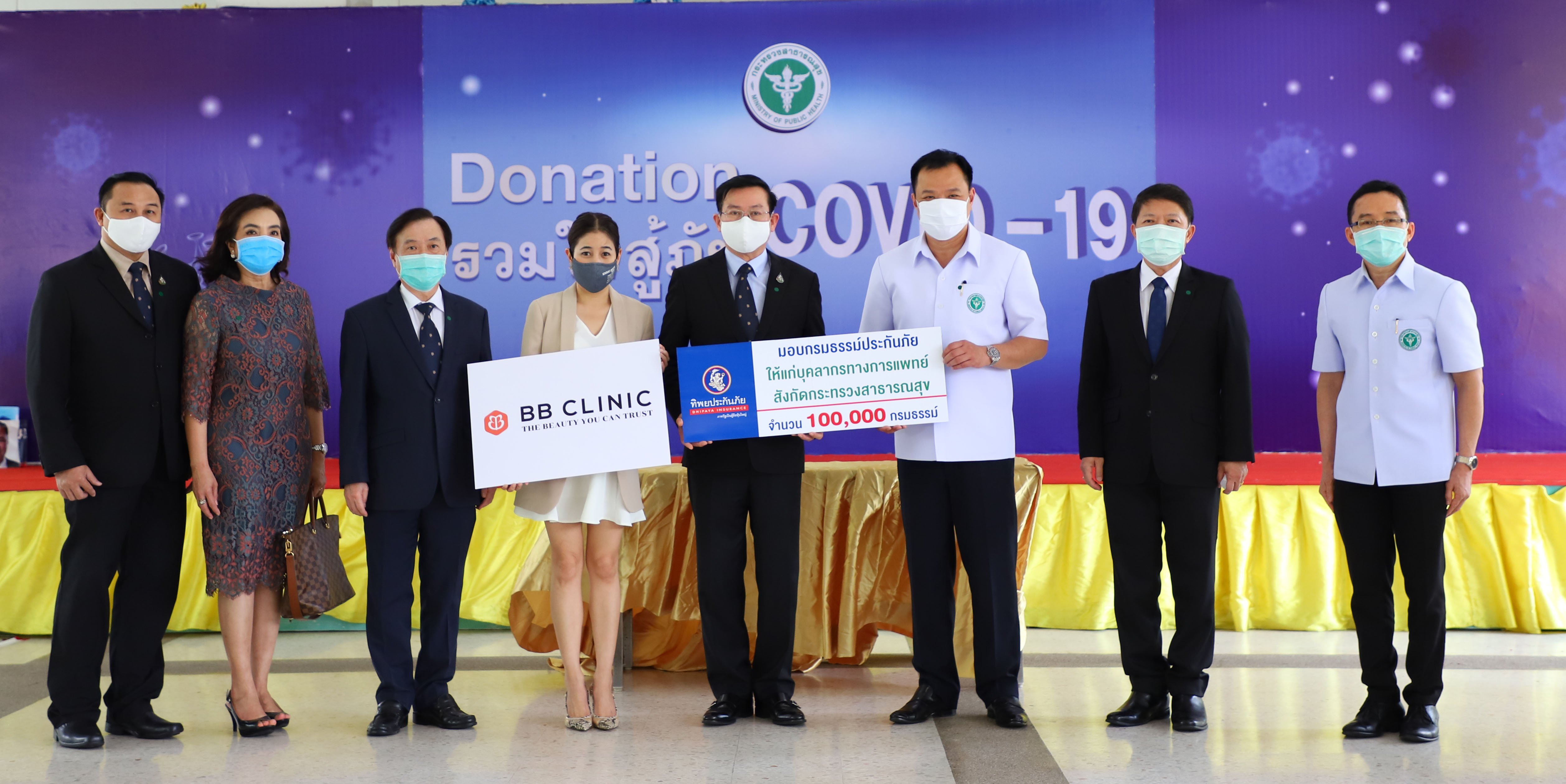 ดร.สมพร สืบถวิลกุล กรรมการผู้จัดการใหญ่ ทิพยประกันภัย คุณสินีนารถ เองตระกูล ประธานเจ้าหน้าที่บริหาร บีบี คลินิก (BB Clinic) ส่งความห่วงใยให้กับบุคลากรสังกัดกระทรวงสาธารณสุข มอบกรมธรรม์ประกันภัยไวรัสโคโรนา (COVID-19) จำนวน 100,000 กรมธรรม์ ให้กับ คุณอนุทิน ชาญวีรกูล รองนายกรัฐมนตรีและรัฐมนตรีว่าการกระทรวงสาธารณสุข เพื่อเป็นขวัญและกำลังใจ ซึ่งกรมธรรม์จะให้ความคุ้มครองประกันภัยไวรัสโควิด -19 แก่บุคลากรสังกัดกระทรวงสาธารณสุข ที่ถือเป็นอีกหนึ่งในหน่วยงานสำคัญ ได้เสียสละ อดทน ทุ่มเทกำลังแรงกาย ต่อสู้กับวิกฤตภัย ไวรัสโควิด - 19 ที่กำลังแพร่ระบาด และเป็นที่วิตกกังวลต่อประชาชน โดยทิพยประกันภัยและบีบี คลินิก ขอร่วมส่งกำลังใจ เพื่อให้คนไทยก้าวผ่านวิกฤตในครั้งนี้ไปให้ได้ ณ สำนักงานปลัดกระทรวงสาธารณสุข
