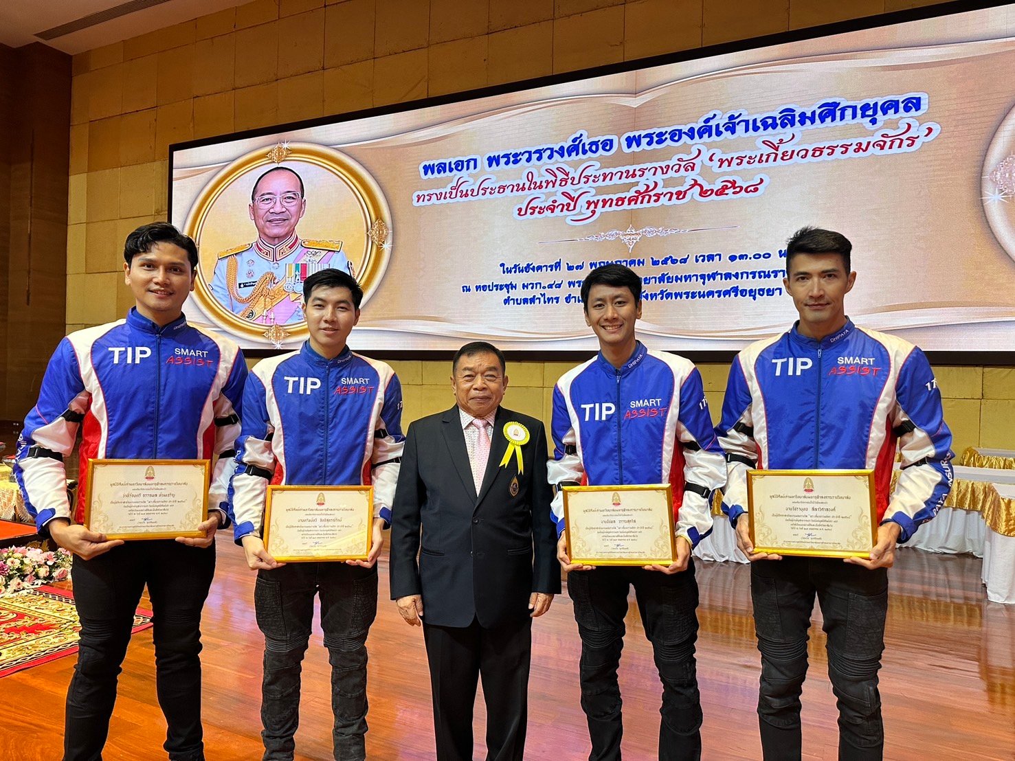 พนักงานสำรวจอุบัติเหตุ หรือ TIP Smart Assist เข้ารับประกาศนียบัตร “พระเกี้ยวธรรมจักร” ด้านการบำเพ็ญสาธารณประโยชน์ ประจำปี 2568 จากพลตรี ไชยนาจ ญาติฉิมพลี ประธานมูลนิธิศิษย์เก่ามหาวิทยาลัยมหาจุฬาลงกรณราชวิทยาลัย ซึ่งผู้ที่เข้ารับรางวัลประกอบด้วยว่าที่ร้อยตรี อรรถพล ท้วมเจริญ นายวัชรายุทธ ลีลาวิศาลวงศ์ นายทรัพย์ทวี อิทธิสุภรณ์รัตน์ นายธัชพล วรรณสุกใส