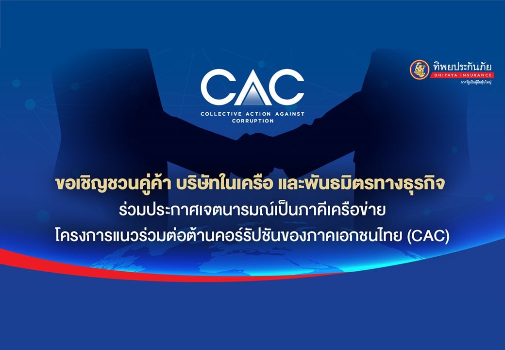 บริษัทฯ ได้ประกาศเจตนารมณ์เข้าเป็นแนวร่วมต่อต้านคอร์รัปชันของภาคเอกชนไทย Thai Private Sector Collective Action Against Corruption (CAC) และได้รับการรับรองการเป็นสมาชิกแล้วนั้น เพื่อเป็นการยกระดับและให้ความสำคัญกับการต่อต้านคอร์รัปชันอย่างต่อเนื่อง จึงใคร่ขอเชิญชวนท่านในฐานะคู่ค้า บริษัทในเครือ หรือพันธมิตรทางการค้าที่ดีตลอดมา ในการเข้าร่วมเป็นภาคีเครือข่ายโครงการแนวร่วมต่อต้านคอร์รัปชันของภาคเอกชนไทย (CAC) ร่วมกัน ทั้งนี้ หากบริษัทของท่าน มีความสนใจเข้าร่วมโครงการ บริษัทฯ มีความยินดีในการให้คำปรึกษาและคำแนะนำ โดยท่านสามารถแจ้งความประสงค์หรือสอบถามข้อมูลเพิ่มเติมได้ที่ e-mail: [email protected]