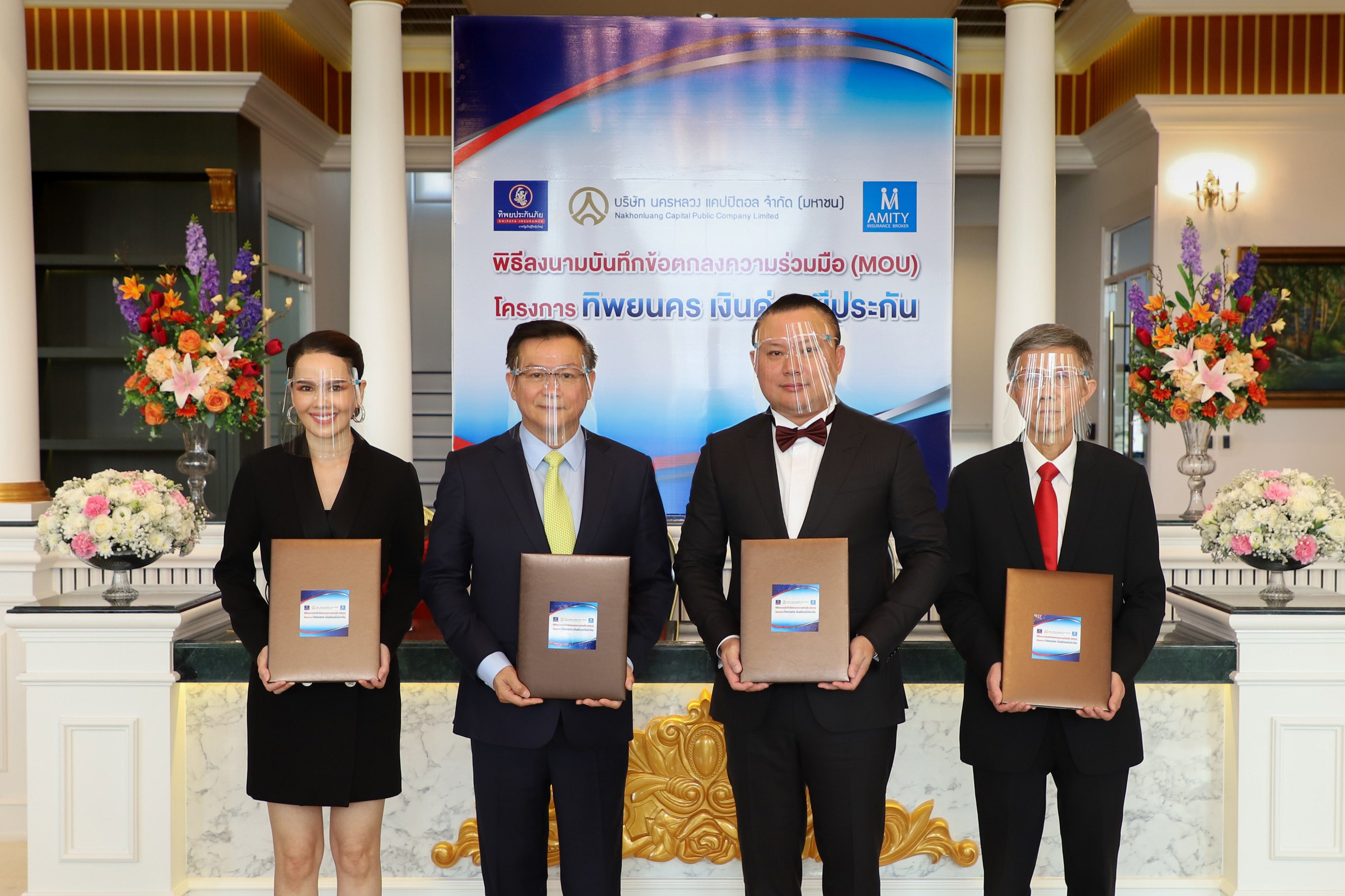 ดร.สมพร สืบถวิลกุล กรรมการผู้จัดการใหญ่ บมจ.ทิพยประกันภัย ดร.เทอดศักดิ์ บุญทศ ประธานเจ้าหน้าที่บริหารและกรรมการผู้จัดการใหญ่ บมจ.นครหลวง แคปปิตอล และ คุณจิตรา วุฒิศิริศาสตร์ กรรมการผู้จัดการ บจ.อะมิตี้ อินชัวร์รันซ์ โบรคเกอร์ ผนึกกำลัง เปิดตัวโครงการ “ทิพยนคร เงินด่วนมีประกัน” ซึ่งเป็นความร่วมมือในการให้หลักประกันที่มั่นคงและความอุ่นใจกับลูกค้าสินเชื่อของนครหลวง แคปปิตอล ผ่านสาขาของ นครหลวง แคปปิตอลกว่า 105 สาขาที่ครอบคลุมทุกจังหวัดในภาคอีสาน เริ่ม 1 เมษายน 2564 นี้ ณ อาคาร นครหลวง แคปปิตอล ถนนบางนา-ตราด