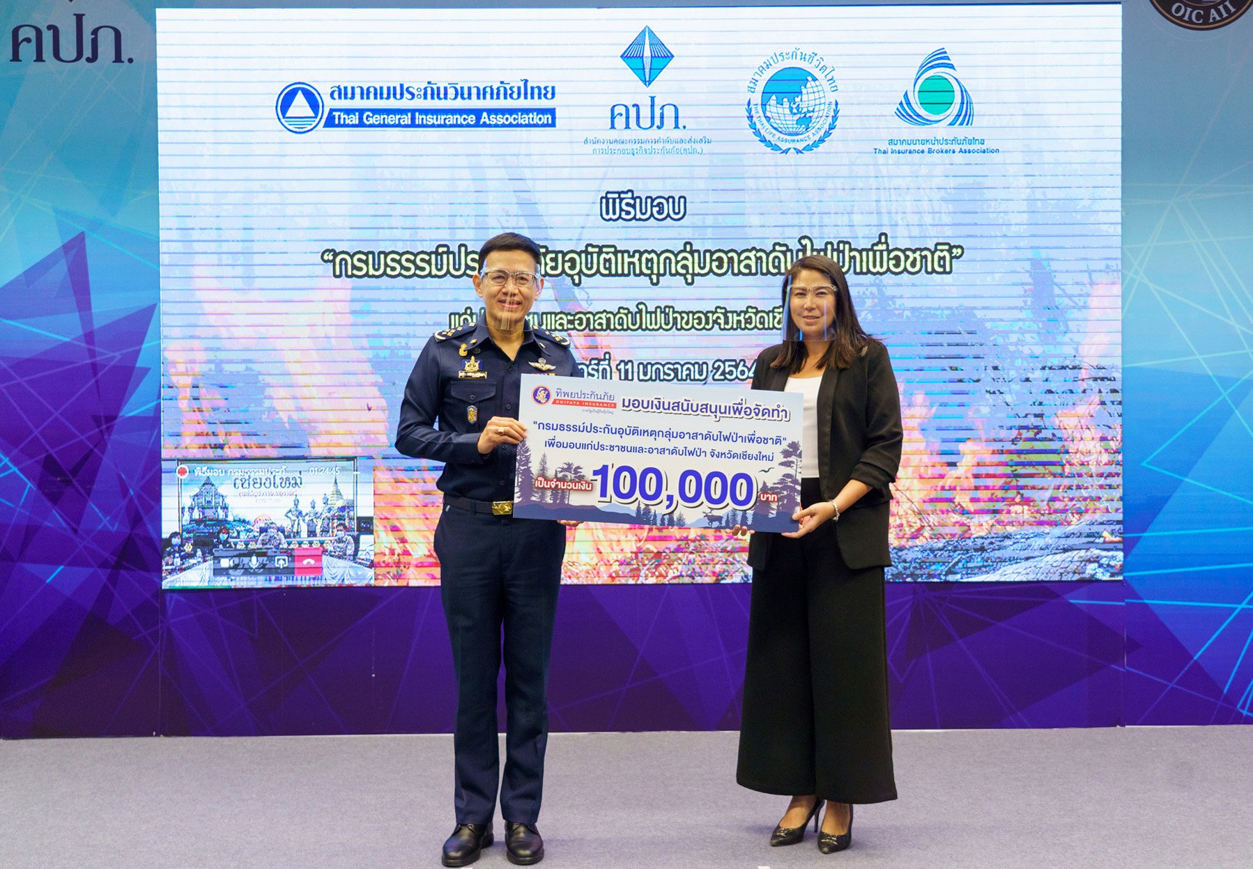คุณณฐินี ธนะรัชต์ ผู้ช่วยกรรมการผู้จัดการใหญ่ ทิพยประกันภัย มอบเงินสนับสนุน จำนวน 100,000 บาท เพื่อจัดหา “กรมธรรม์ประกันอุบัติเหตุกลุ่มอาสาดับไฟป่าเพื่อชาติ” ให้กับประชาชนและอาสาสมัครดับไฟป่า จ.เชียงใหม่ จำนวน 35,000 คน เพื่อเป็นขวัญและกำลังใจในการปฏิบัติหน้าที่ โดยมี ดร.สุทธิพล ทวีชัยการ เลขาธิการคปภ. เป็นผู้แทนรับมอบ และนายเจริญฤทธิ์ สงวนสัตย์ ผู้ว่าราชการจังหวัดเชียงใหม่ รับมอบ ผ่าน VDO Conference ณ สำนักงาน คปภ. ถนนรัชดาภิเษก