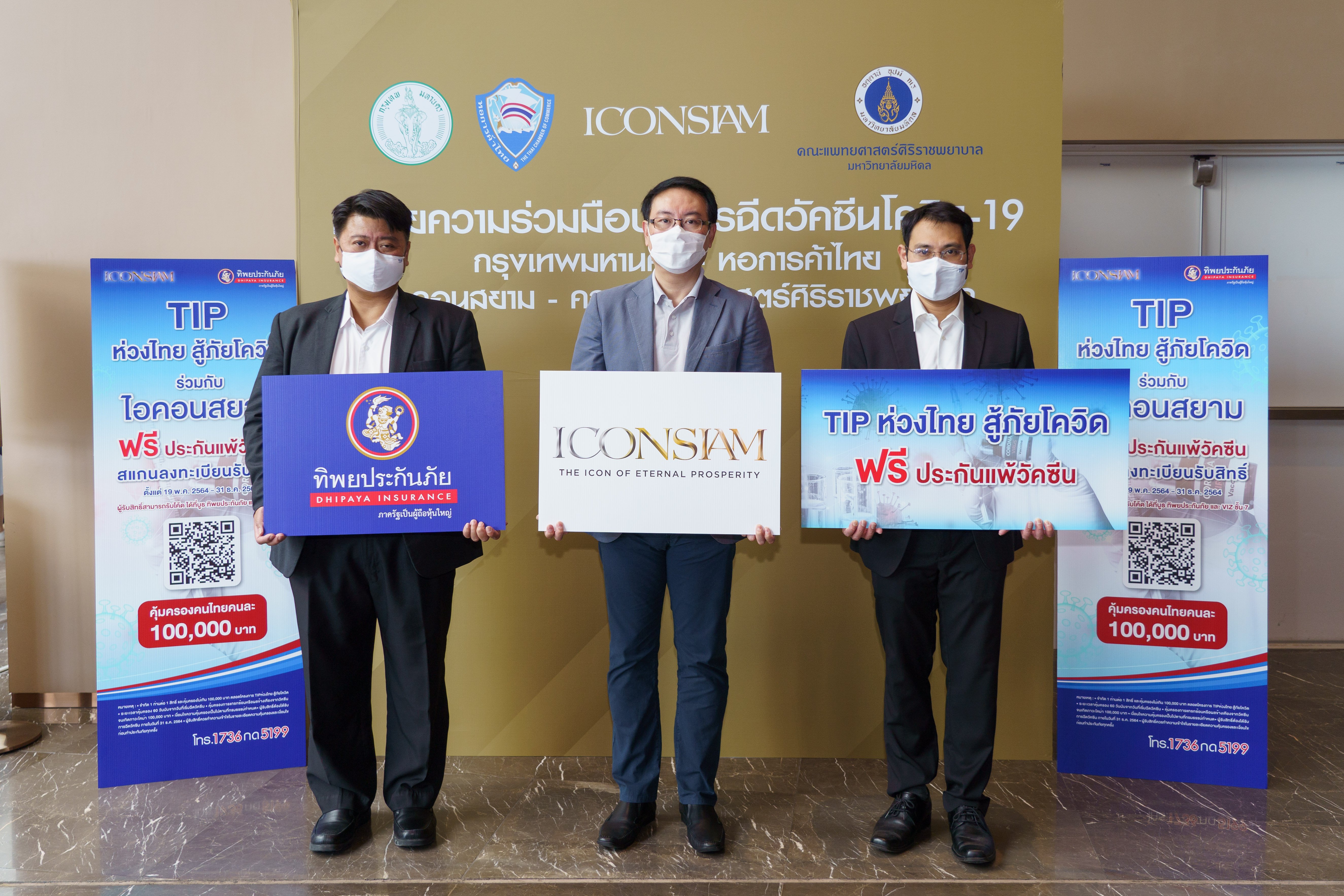 คุณอนุกูล เย็นใจ ผู้ช่วยกรรมการผู้จัดการใหญ่ สายรับประกันภัย 1   ดร.พลรัตน์ เอกโยคยะ  ผู้ช่วยกรรมการผู้จัดการใหญ่ สายงานกลยุทธ์   บริษัท ทิพยประกันภัย จำกัด  (มหาชน)   คุณสุพจน์ ชัยวัฒน์ศิริกุล กรรมการผู้จัดการ บริษัท ไอคอนสยาม จำกัด   ร่วมมอบประกันภัยแพ้วัคซีนโควิด-19 ตามโครงการ “TIP ห่วงไทย สู้ภัยโควิด”  และน้ำดื่มทิพย จำนวน 304,500 ขวด ให้กับประชาชนที่มารับการฉีดวัคซีนโควิด-19  ตลอดระยะเวลาของโครงการ เพื่อเป็นการสนับสนุนให้ประชาชนเข้ารับวัคซีน ลดการแพร่ระบาด ลดความรุนแรงหากติดเชื้อ ลดจำนวนผู้ป่วย  โดยสิทธิ์นี้จะให้ความคุ้มครองการเกิดภาวะแทรกซ้อนหรือผลข้างเคียงจนเกิดภาวะโคม่าจากการฉีดวัคซีน ทุนประกัน 100,000 บาท ระยะเวลาคุ้มครอง 60 วัน หลังจากการฉีดวัคซีน ณ ไอคอนสยาม