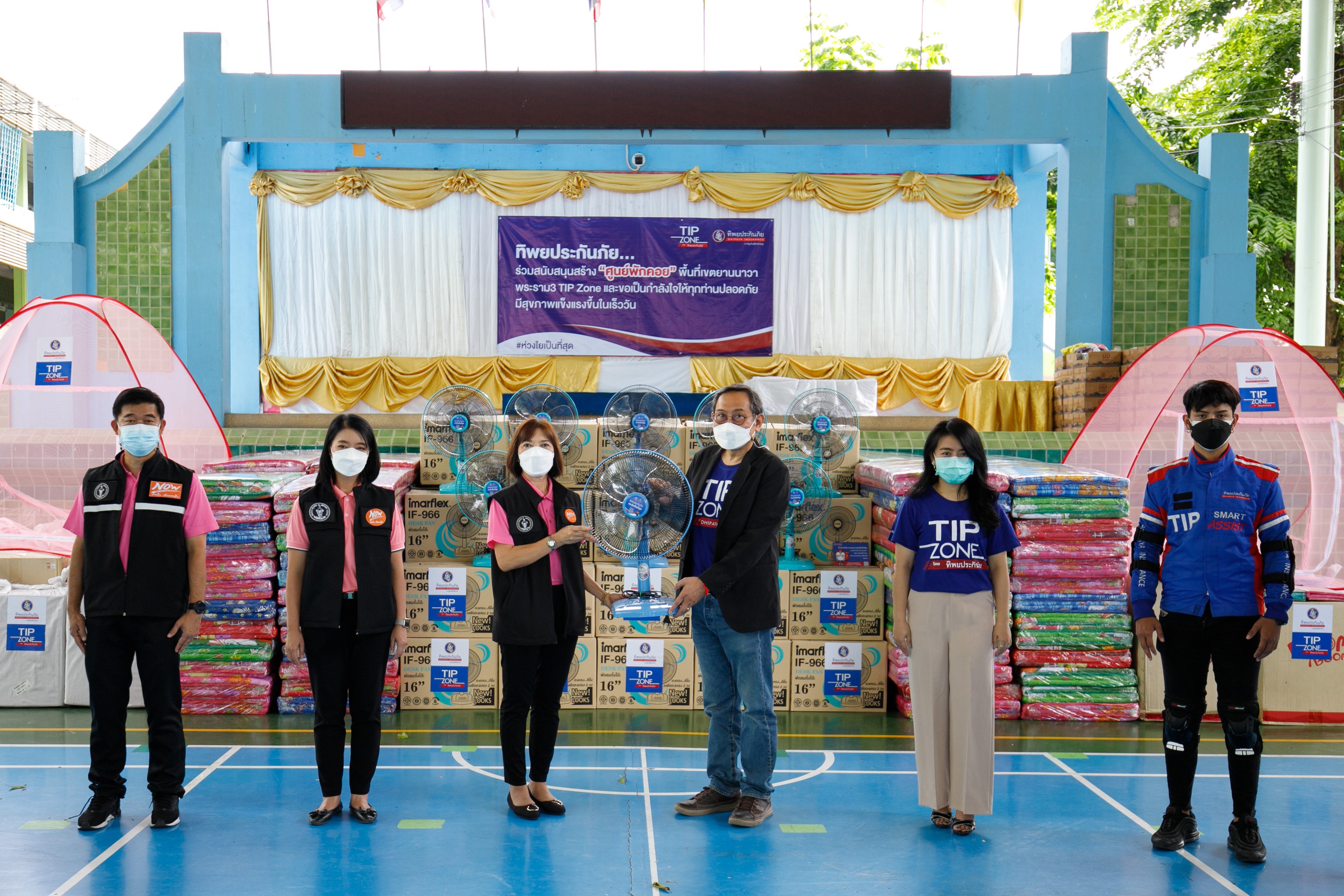 ทิพยประกันภัย สนับสนุนการจัดตั้งศูนย์พักคอย (Community Isolation) ที่สามารถรองรับผู้ติดเชื้อโควิด-19  จำนวน 100 เตียง ในพื้นที่ยานนาวา พระรามสาม โดย คุณอาคม ไม้ดัดจันทร์ ผู้ช่วยกรรมการผู้จัดการใหญ่ ทิพยประกันภัย มอบอุปกรณ์ของใช้ สำหรับผู้ติดเชื้อไวรัสโควิด-19 อาทิ ที่นอนพร้อมชุดเครื่องนอน มุ้ง พัดลม ในโครงการ TIP ZONE  จำนวน 100 ชุด ให้กับ คุณภาวนา ใจเสงี่ยม ผู้อำนวยการเขตยานนาวา โดยมี คุณอรชา มุ้ยเสมา ผู้ช่วยผู้อำนวยการเขตยานนาวา และ คุณอิทธิพล อิงประสาร ผู้ช่วยผู้อำนวยการเขตยานนาวา ร่วมรับมอบ ณ ศูนย์พักคอย หอประชุมโรงเรียนวัดดอกไม้ ยานนาวา กรุงเทพฯ