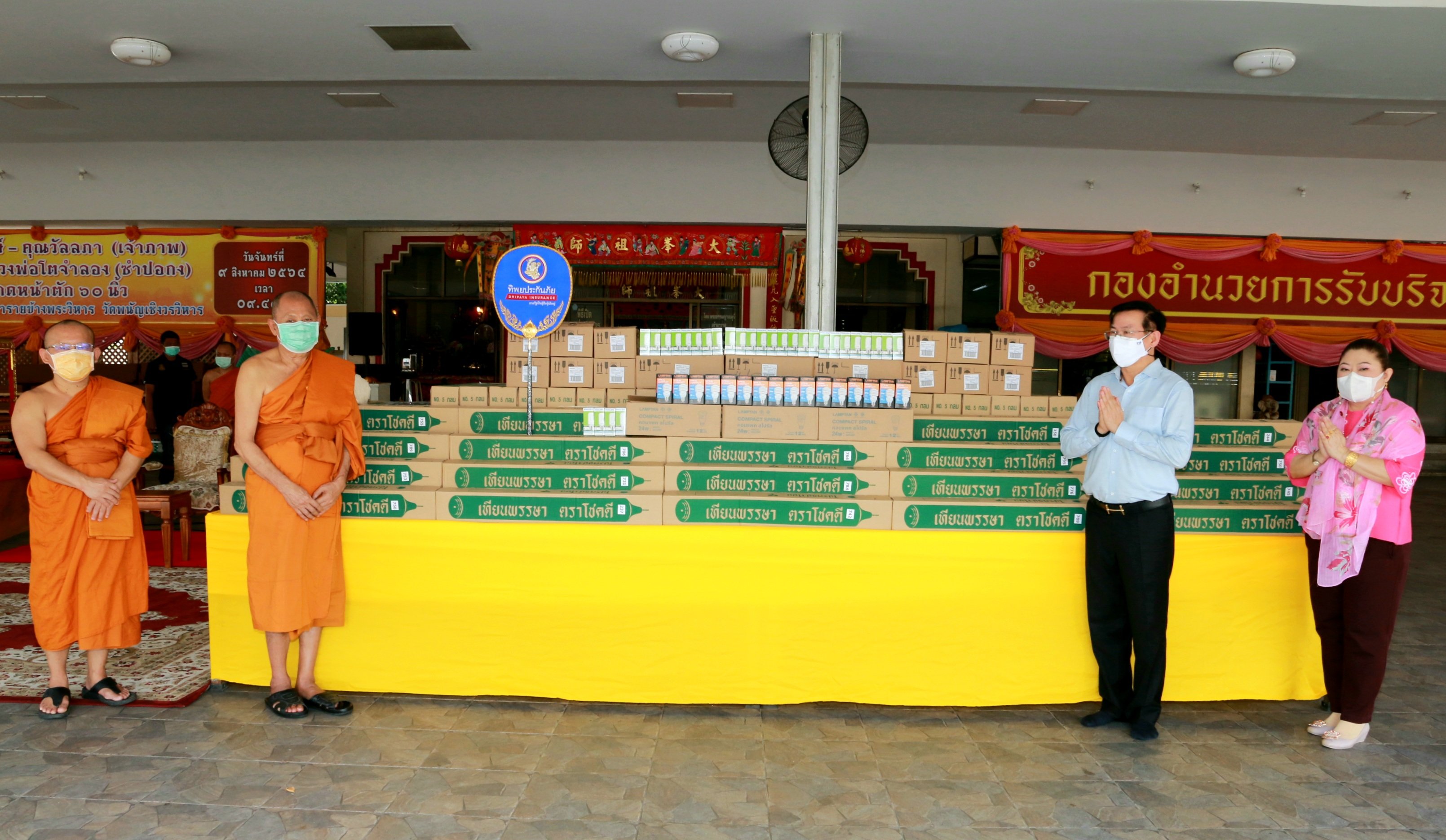 ดร.สมพร สืบถวิลกุล กรรมการผู้จัดการใหญ่ นางวิชชุดา ไตรธรรม ที่ปรึกษากรรมการผู้จัดการใหญ่ ทิพยประกันภัย จัดโครงการสร้างบุญมหากุศล “พลังบุญทิพยร่วมสร้าง ครั้งที่ 180” ถวายเทียนพรรษา มหาจักรพรรดิ มหาบารมี จำนวน 108 คู่ พร้อมจตุปัจจัยไทยธรรมเนื่องในช่วงเข้าพรรษา โดยนิมนต์ พระธรรมรัตนมงคล เจ้าคณะจังหวัดพระนครศรีอยุธยา เจ้าอาวาสวัดพนัญเชิงวรวิหาร และ พระเมธีวราภรณ์ รองเจ้าคณะจังหวัดพระนครศรีอยุธยา รองเจ้าอาวาสวัดพนัญเชิงวรวิหาร มาเป็นประธานสงฆ์ เพื่อถวายเป็นพุทธบูชา ธรรมบูชา สังฆบูชา และทำบุญให้กับประเทศไทย ให้สามารถผ่านพ้นวิกฤตการณ์ในครั้งนี้ไปได้อย่างรวดเร็ว ณ วัดพนัญเชิงวรวิหาร จังหวัดพระนครศรีอยุธยา