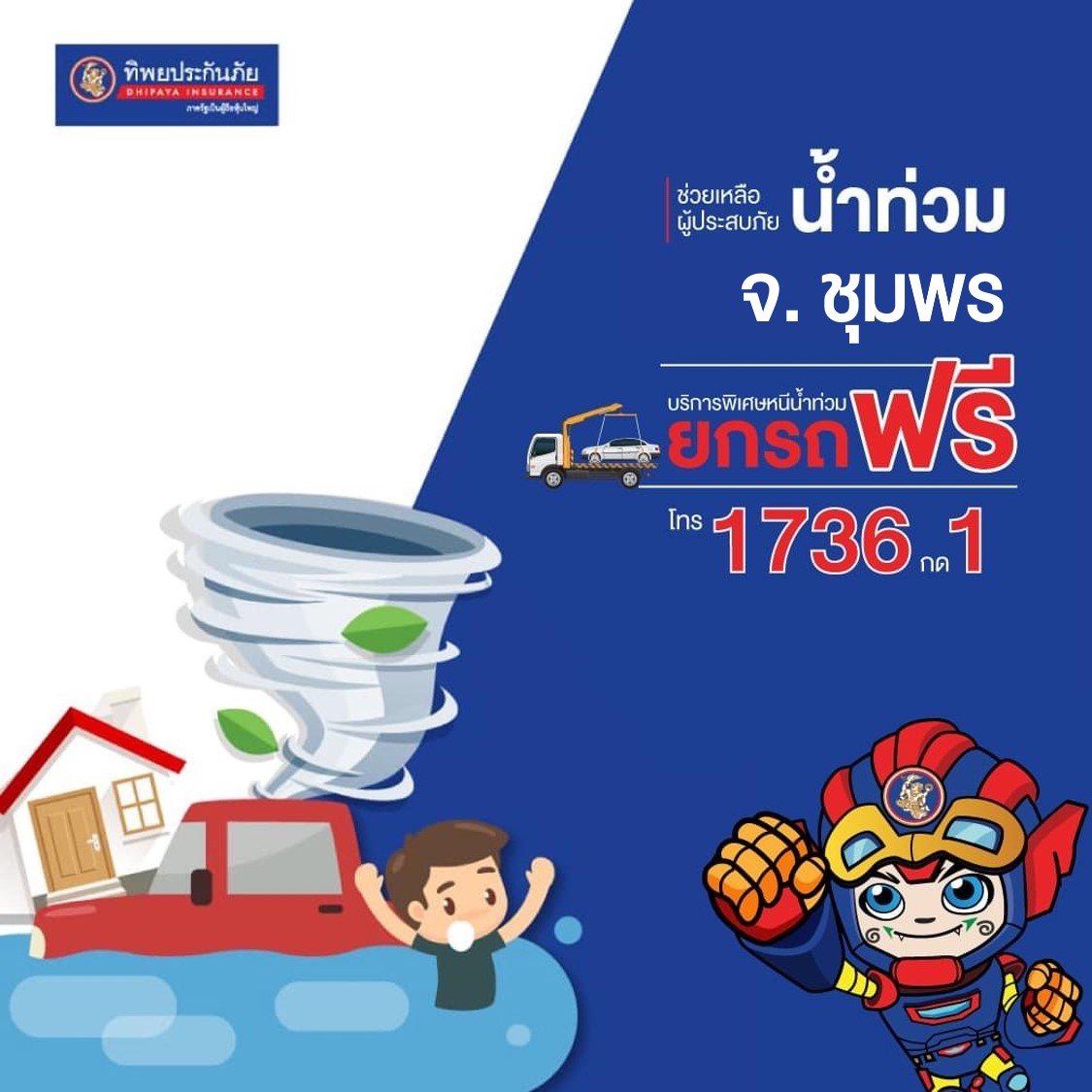 ดร.สมพร สืบถวิลกุล ประธานเจ้าหน้าที่บริหาร บมจ. ทิพย กรุ๊ป โฮลดิ้งส์ และ กรรมการผู้จัดการใหญ่ บมจ.ทิพยประกันภัย ส่งทีม TIP Smart Assist พร้อมหน่วยหนุมานทิพยจิตอาสา ลงพื้นที่ให้ความช่วยเหลือ พี่น้องประชาชนจังหวัดชุมพร ที่ได้รับผลกระทบจากฝนตกหนัก ทำให้น้ำท่วมฉับพลันและน้ำไหลหลาก สร้างความเสียหายและความเดือดร้อนอยู่ในขณะนี้ เพื่อบรรเทาความเดือดร้อนในเบื้องต้น สำหรับผู้ประสบภัยทุกท่านที่ต้องการความช่วยเหลือเคลื่อนย้ายรถออกจากพื้นที่น้ำท่วม ทิพยประกันภัยได้จัดเตรียมรถยกเพื่อช่วยเหลือฟรีไม่ว่าจะเป็นลูกค้าของบริษัทฯหรือไม่ก็ตาม และสำหรับลูกค้าของทิพยประกันภัย สามารถโทร.ขอความช่วยเหลือ หรือแจ้งเคลมที่ Hotline 1736 กด 1 ตลอด 24 ชั่วโมง หรือติดต่อสำนักงานสาขาในพื้นที่นอกจากนี้ ยังได้ร่วมกับสถานีบริการน้ำมัน ปตท. ที่เข้าร่วมโครงการ TIP@pttstation  บจก.เค.พี.เอส.กรุ๊ป (สถานีบริการน้ำมัน เดอะไทเกอร์)  อ.หลังสวน จ.ชุมพร ให้ผู้ประสบภัยน้ำท่วมสามารถนำรถมาจอดได้ฟรีอีกด้วย