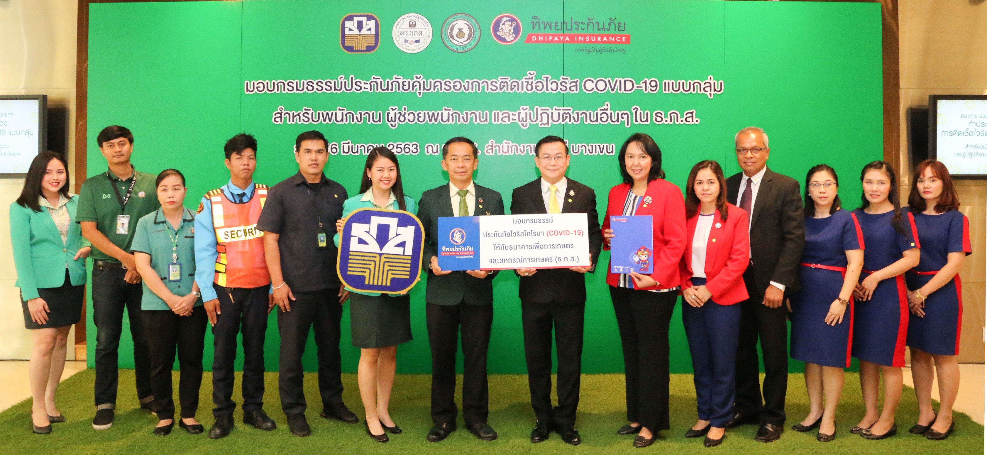 ดร.สมพร สืบถวิลกุล กรรมการผู้จัดการใหญ่ ทิพยประกันภัย มอบกรมธรรม์ ประกันภัยไวรัสโคโรนา (COVID-19) ให้กับ นายอภิรมย์ สุขประเสริฐ ผู้จัดการ ธนาคารเพื่อการเกษตรและสหกรณ์การเกษตร (ธ.ก.ส.) ซึ่งกรมธรรม์ดังกล่าวได้ให้ความคุ้มครอง ประกันภัยไวรัสโคโรนา (COVID-19) เพื่อความอุ่นใจ กับพนักงาน ผู้ช่วยพนักงาน และผู้ปฏิบัติงานใน ธนาคาร ธ.ก.ส. ทั่วประเทศ ซึ่งมีจำนวนกว่า 27,000 คน ณ ธนาคารเพื่อการเกษตรและสหกรณ์การเกษตรสำนักงานใหญ่ บางเขน