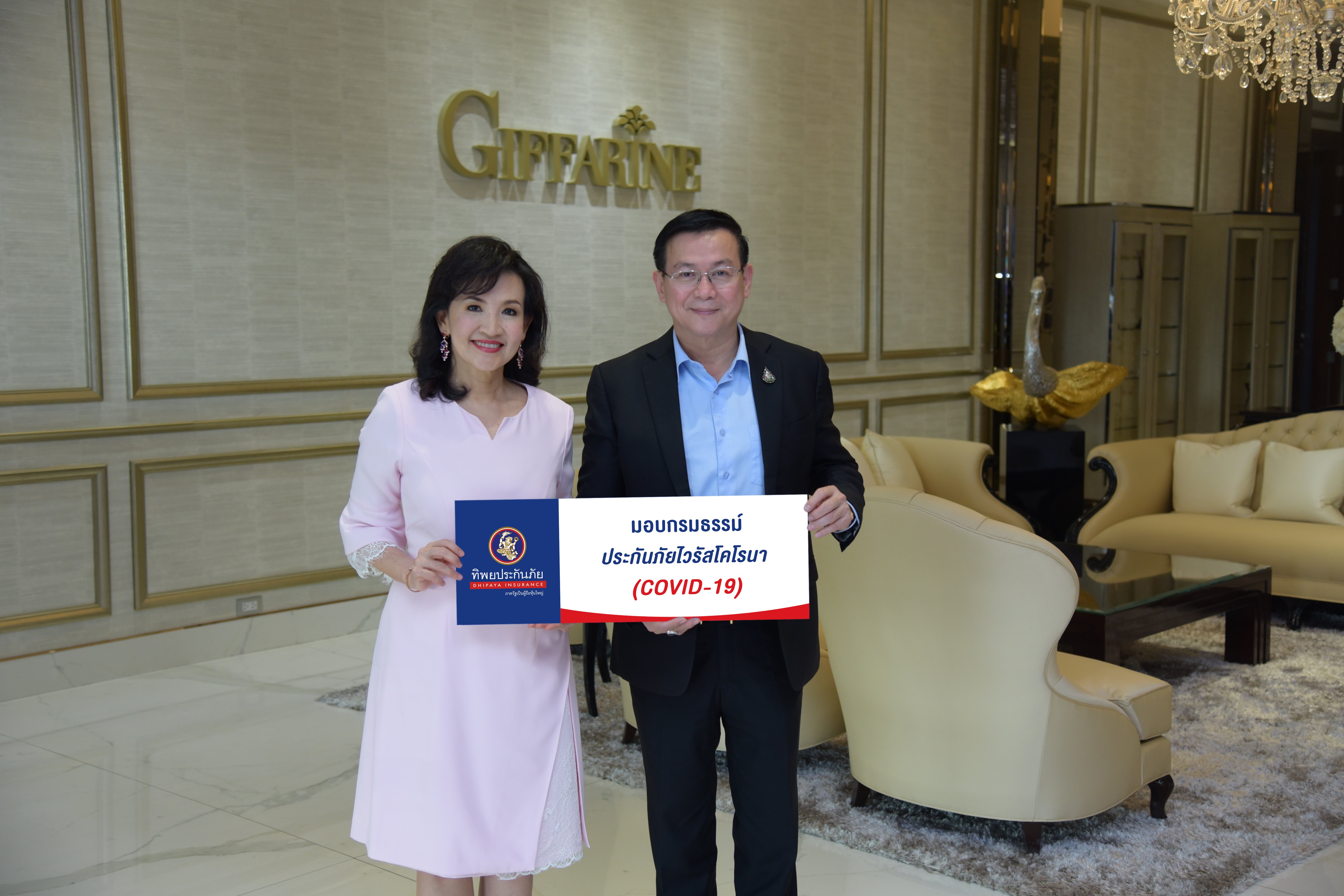 ดร.สมพร สืบถวิลกุล กรรมการผู้จัดการใหญ่ ทิพยประกันภัย มอบกรมธรรม์ ประกันภัยไวรัสโคโรนา (COVID -19) ให้กับ พญ.นลินี ไพบูลย์ MD President Giffarine โดยกรมธรรม์ดังกล่าวได้ให้ความคุ้มครองการติดเชื้อไวรัส COVID-19 ที่กำลังแพร่ระบาดอยู่ในขณะนี้ ซึ่งเป็นการมอบความอุ่นใจ เพื่อเป็นขวัญและกำลังใจ ให้กับพนักงานกิฟฟารีน ซึ่งมีจำนวนกว่า 1,500 คน ณ Giffarine Skyline Unity