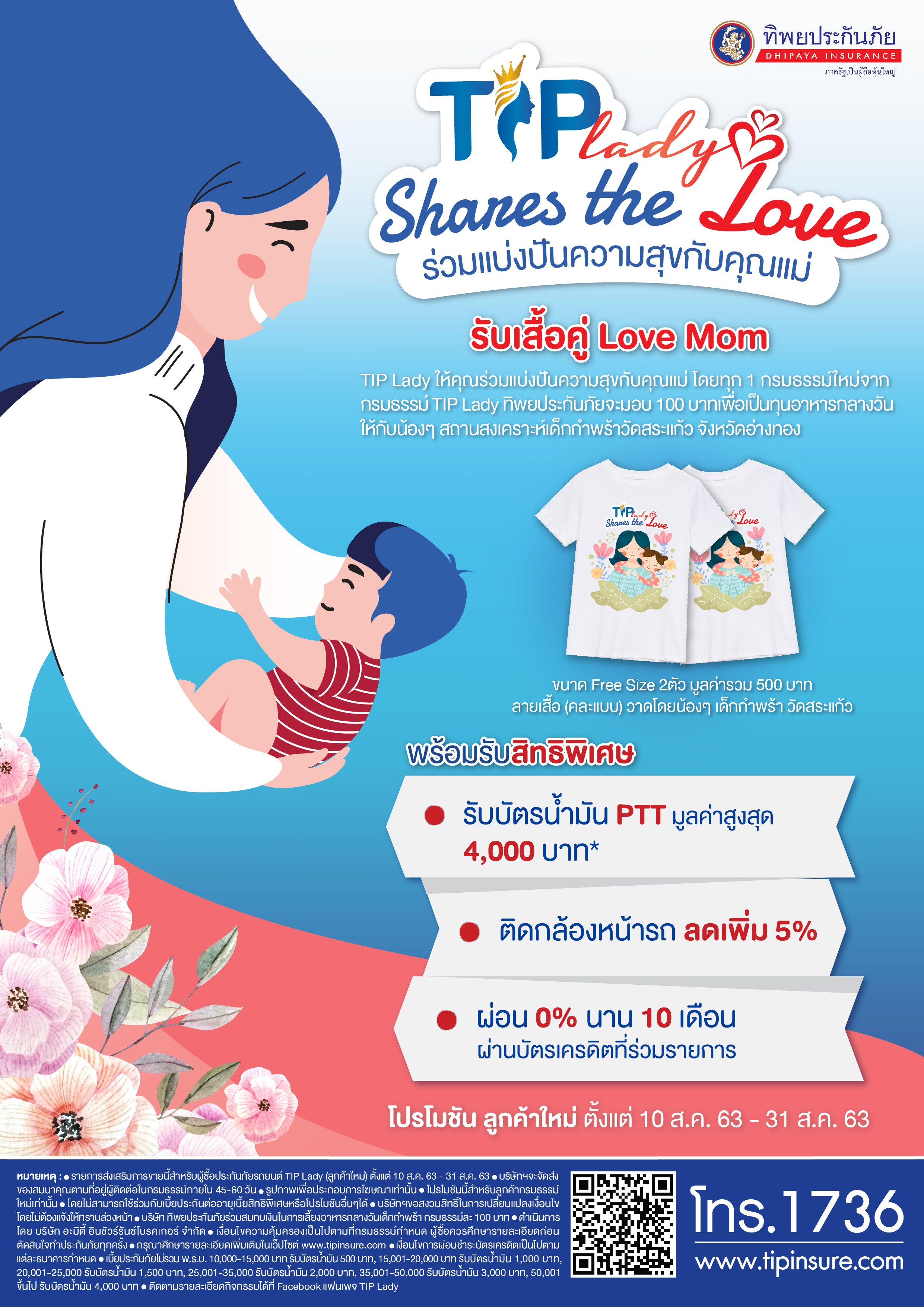 ทิพยประกันภัย ชวนคุณมอบความสุขตลอดเดือนสิงหาคมเดือนแห่งวันแม่ "TIP Lady Shares the Love" กับประกันภัยรถยนต์ TIP Lady ให้มากกว่าประกันชั้น 1 ให้คุณร่วมแบ่งปันความสุขกับคุณแม่ โดยทุก 1 กรมธรรม์ใหม่ของ TIP Lady ตั้งแต่วันที่ 10 - 31 สิงหาคม 2563 ทิพยประกันภัยจะมอบ 100 บาทเพื่อเป็นทุนอาหารกลางวันให้กับน้องๆ สถานสงเคราะห์เด็กกำพร้าวัดสระแก้ว จังหวัดอ่างทอง นอกจากนี้ยังมีโปรโมชั่นดีๆถึง 4 ต่อคือ